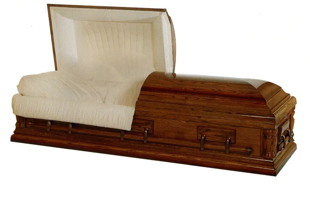 Most Hardwood Caskets are made of solid wood, finished in a satin or gloss coat. Some may be hand polished. Their design may be square-cornered, round-cornered or round-cornered urn shapes. Typically, select woods (poplar, willow) will be the least expensive wood caskets, followed by pine, oak, birch, maple, cherry, black walnut and mahogany. Other species of wood used in the manufacture of caskets are ash, elm, redwood, cedar, etc. It takes 130 to 150 board feet of lumber to produce a typical hardwood casket. Some caskets require more wood if they are made of 3" or 4" plank material. Hardwood caskets are sometimes the most expensive caskets manufactured. Solid hardwood caskets are manufactured like fine furniture. They are assembled by craftsmen; sanded for painting or staining. Some have hand-rubbed finishes.